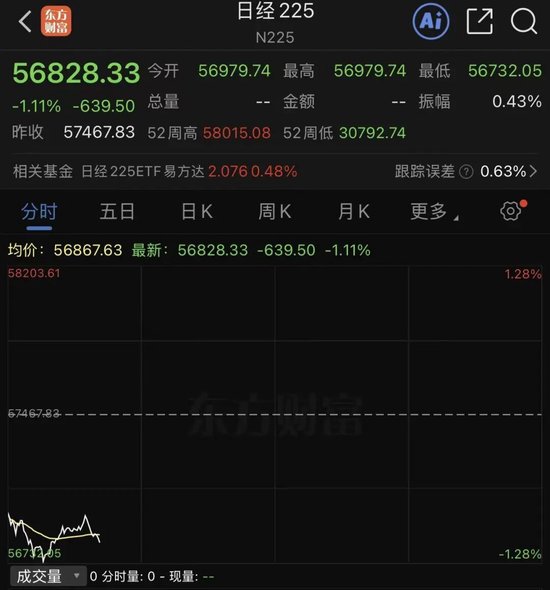 日经225指数开盘跌0.89%,盘中一度跌超1.28%,跌超733点。截至发稿,跌幅为1.11%,报56828.33点。