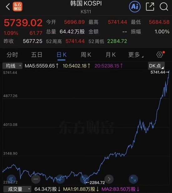 2月20日,韩国KOSPI指数开盘涨幅0.27%,盘中上涨1.13%触及5741.44点,创下历史新高,截至发稿,涨幅回落至1.09%,报5739.02点。