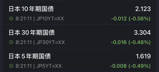 日本5年期国债收益率跌至1.619%。10年期国债收益率跌至2.123%。30年期日本国债收益率跌至3.304%。